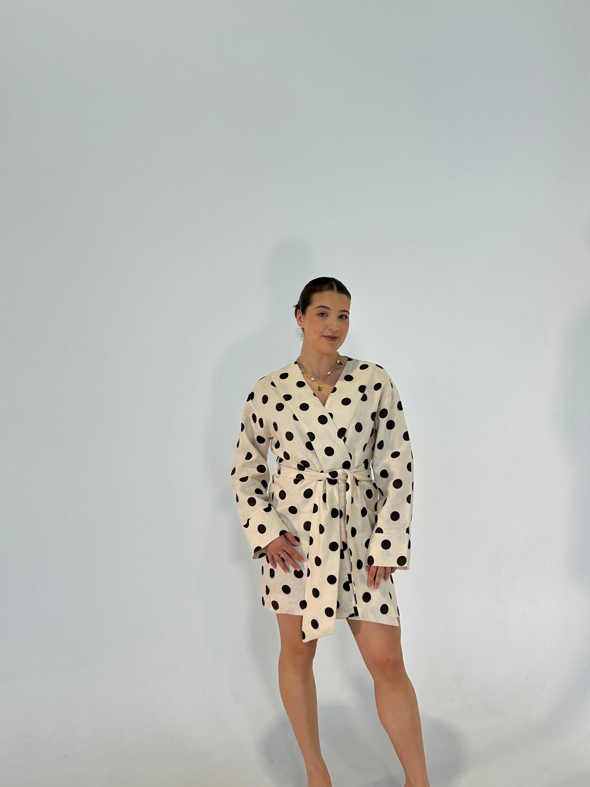 Step into effortless elegance with Lé Polka — a sophisticated robe that marries classic charm with playful polka dots. Crafted from ultra-soft, flowing linen in a creamy backdrop accented by warm cocoa dots, this piece is designed to take you seamlessly from sun-drenched beach afternoons to chic evening soirées. The flattering silhouette, enhanced with a waist tie, creates a refined yet relaxed look that’s both timeless and modern. Lé Polka is your go-to statement for understated luxury with a whimsical twist.