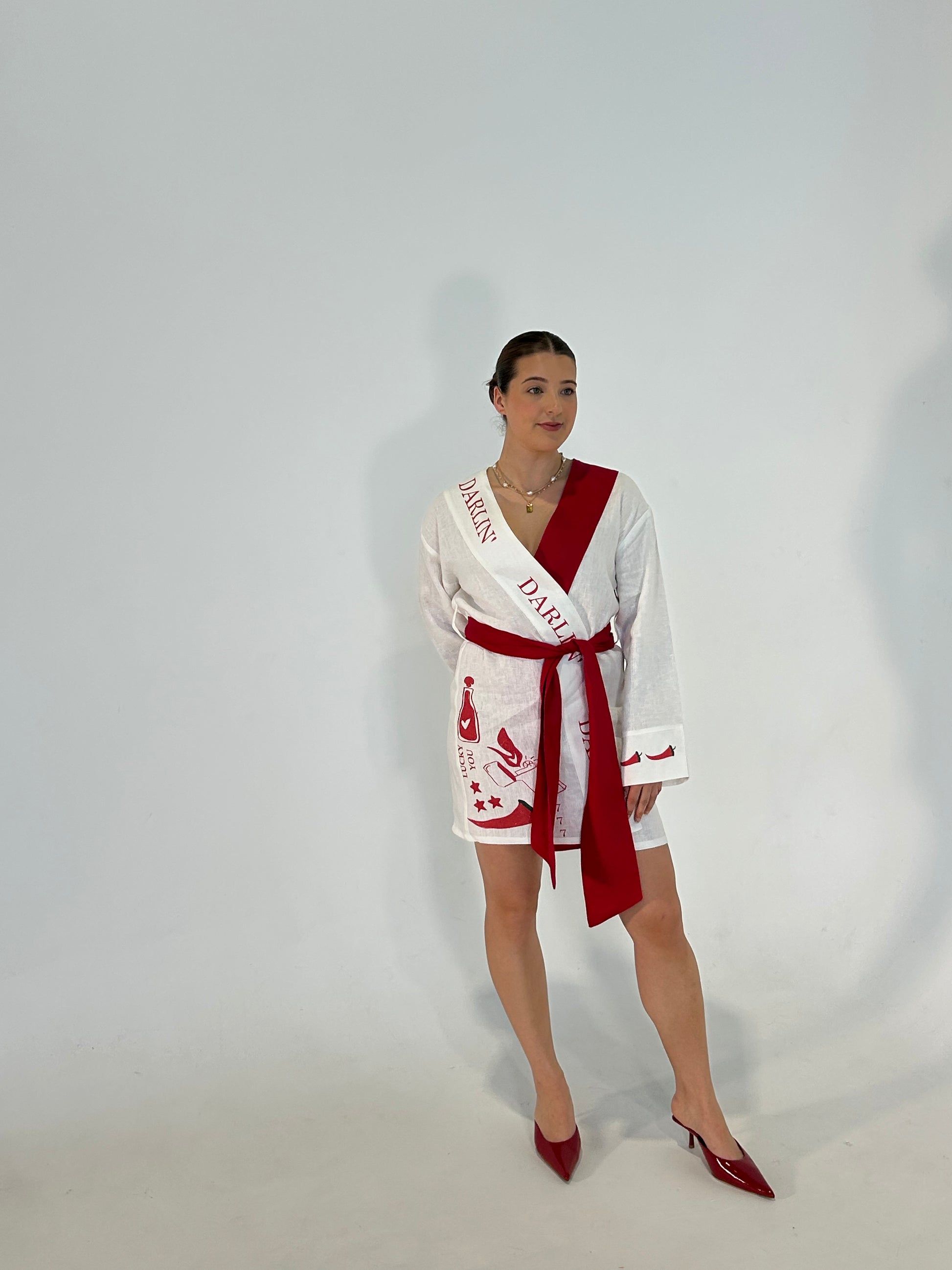 The Lucky Darlin’ Robe is a love letter to laid-back luxury — where playful prints meet considered design. Crafted from airy, lightweight linen, this robe drapes effortlessly with a relaxed silhouette and a contrast crimson sash that cinches with soft structure.